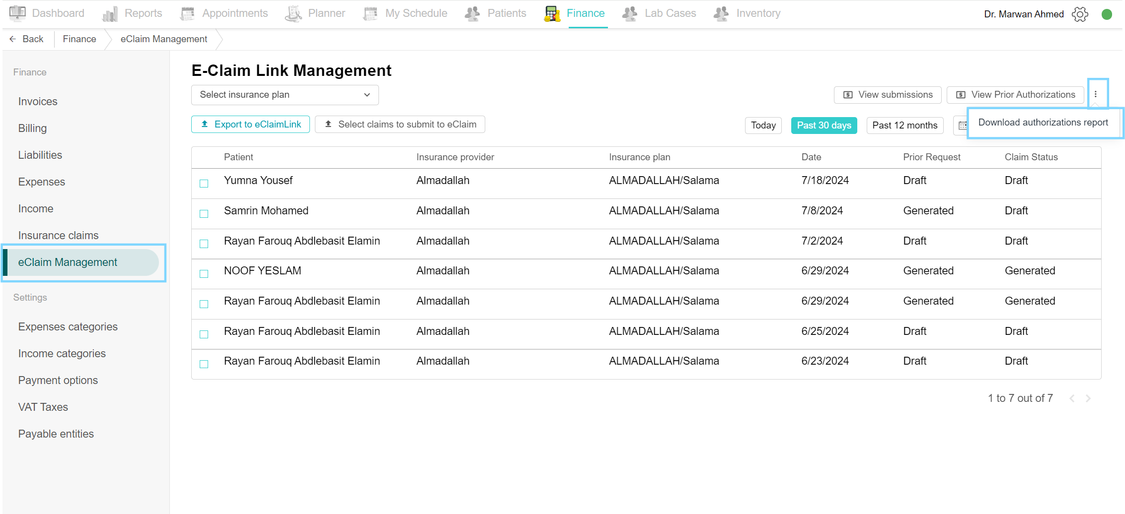 You can download the authorization report of all the claims. Go to the Finance tab and click on the eClaim Management page. Click the three-dot option on the side of the “View Prior Authorizations” button. Select “Download authorizations report” from the options. Select the insurance plans and the date range and the report is downloaded.