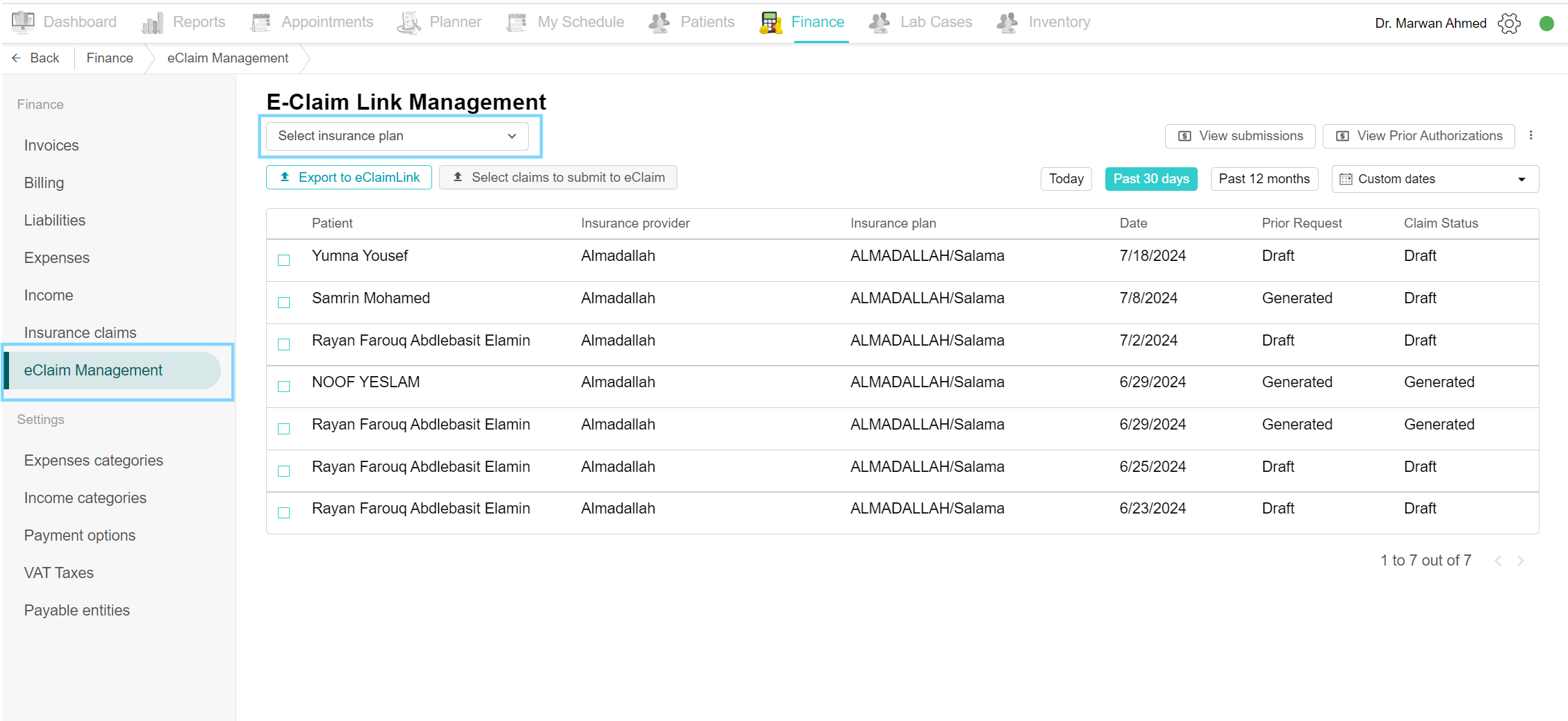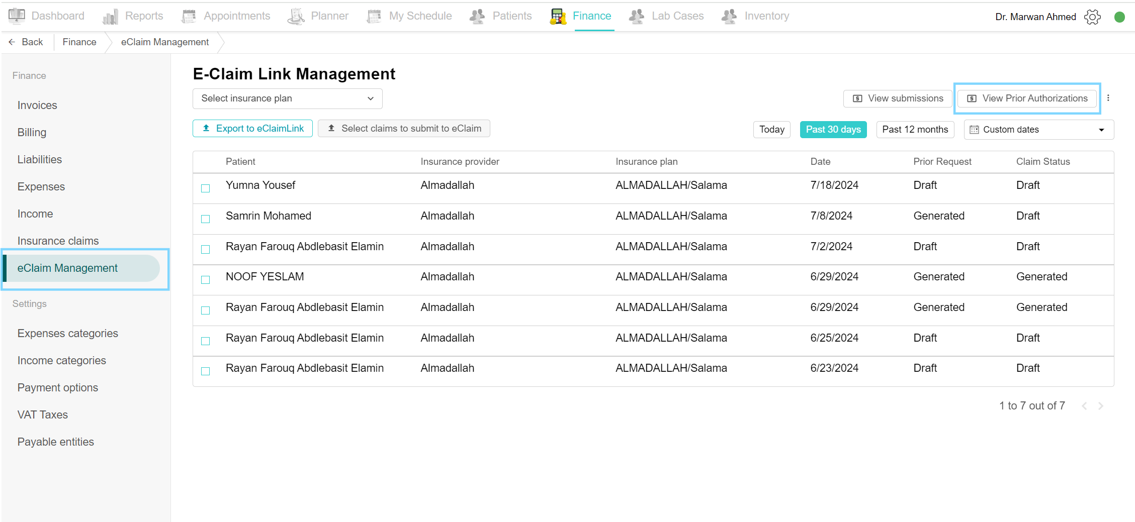 To view all insurance claims with their details, navigate to the Finance tab and click on the eClaim Management page. A list of all insurance claims is shown, it shows the patient's name, insurance providers and plans, date and the status of the prior request and claim. Click on a claim to edit, update or submit.