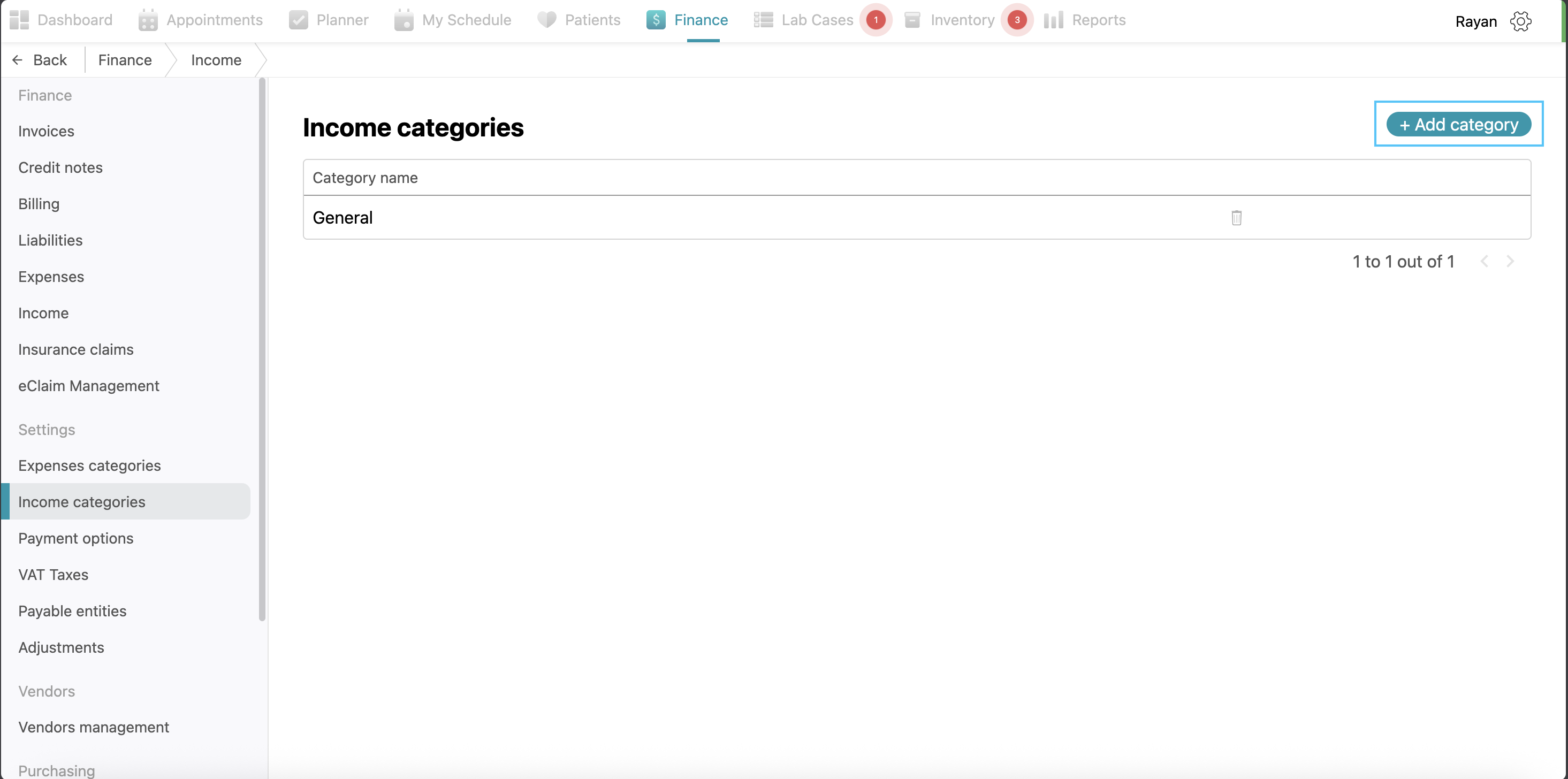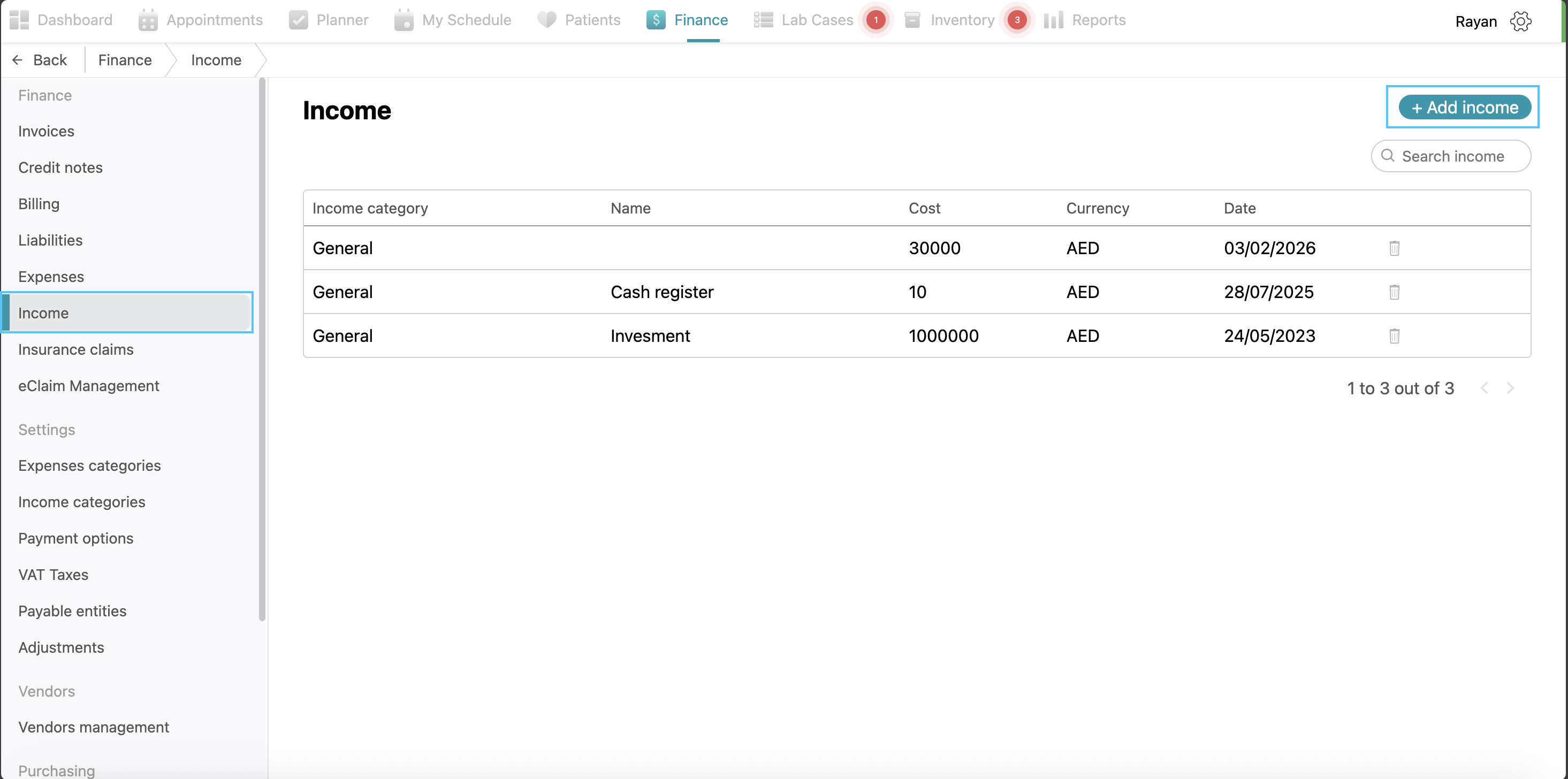 The Income section tracks all revenue flowing into the clinic. To log a new entry, click the + Add income button and fill in the Income name, Category, and Date. You must also provide the Amount, Currency, and Payment method used for the transaction. If you need to make changes to a previously recorded income, simply click on the record in the list, update the information in the pop-up, and click Save.