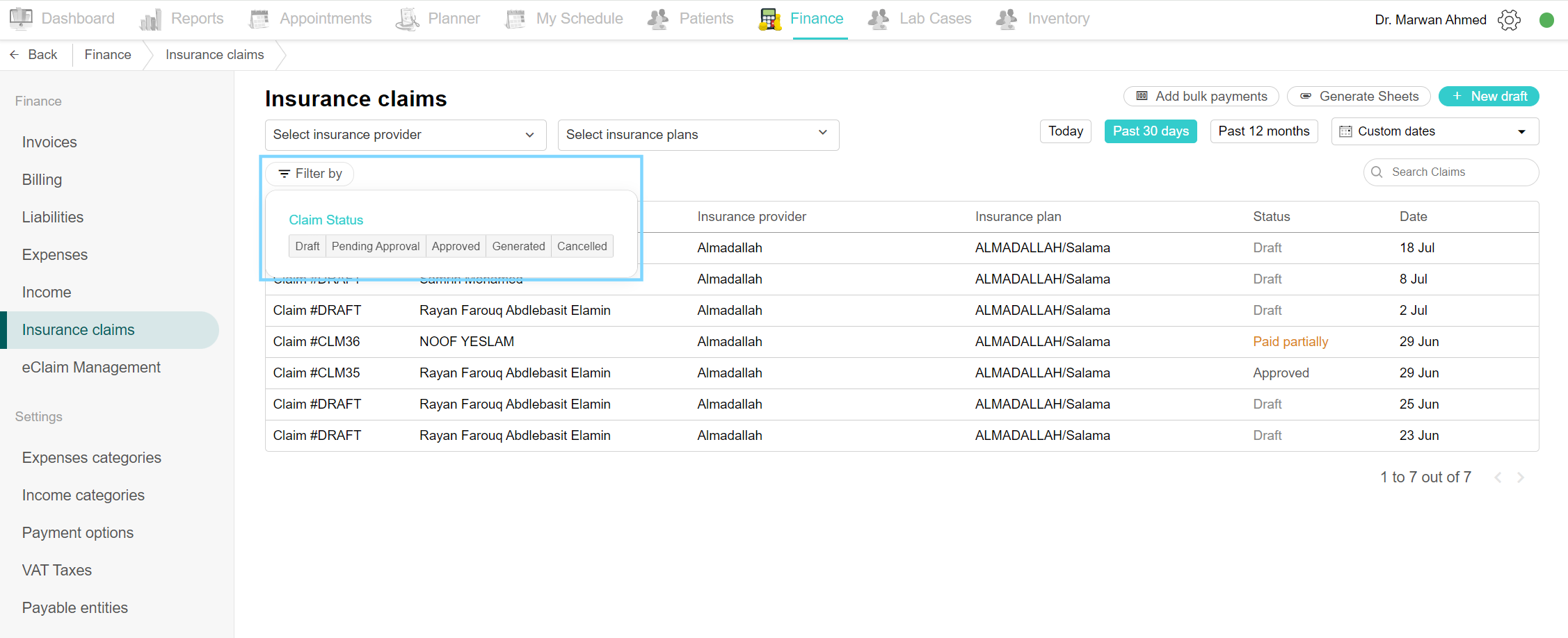 Open Insurance Claims from the Finance side menu. By default, today's claims are visible. You can view claims by selecting filters like "Past 30 days", or "Past 12 months", or by choosing custom dates. Click on "Custom Dates", select the desired period, and view the claims during that period.