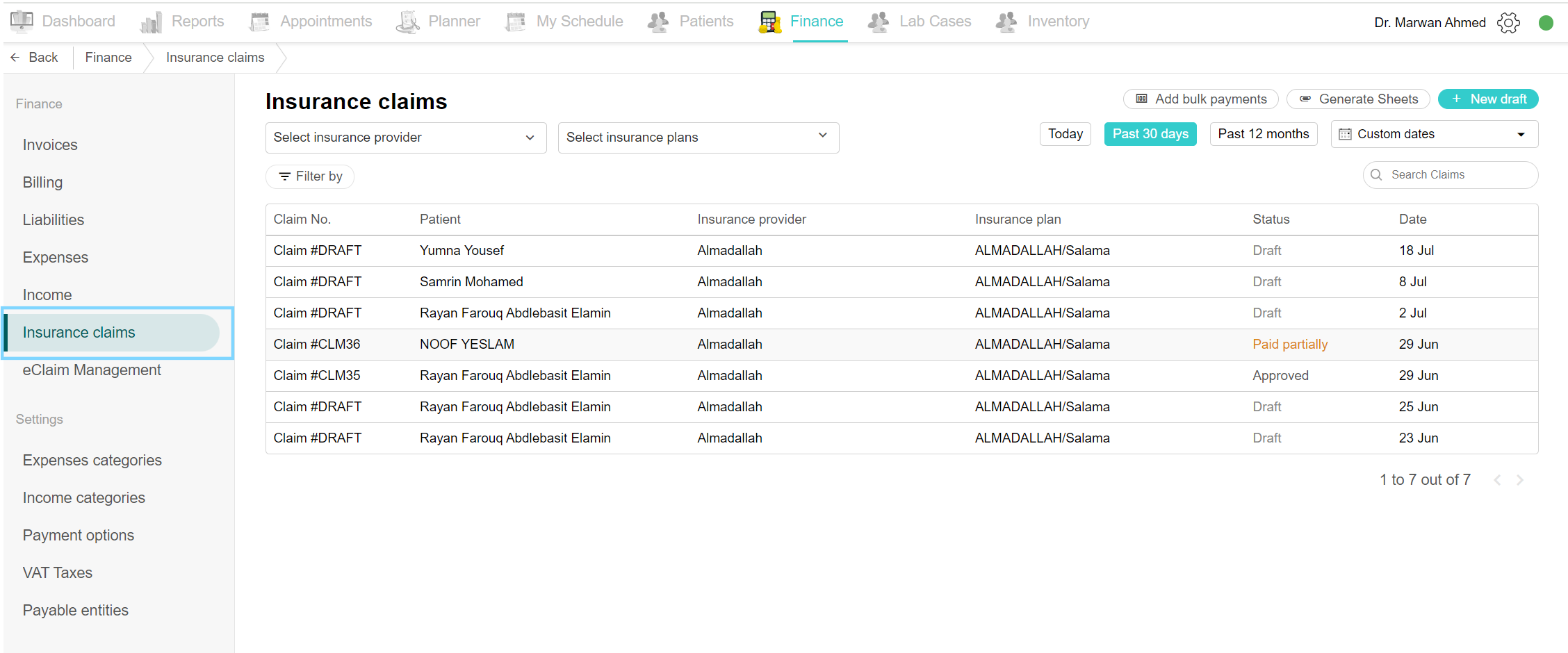 Go to Finance and select Insurance Claims from the side menu. Click "New Draft" to initiate a new claim draft. Search and select the patient's name, insurance plan, and draft date, then click the generate button. Click "Add unclaimed items" to include items in the claim, displaying covered fees, insurance net (amount to be paid by insurance), and patient share (amount to be paid by the patient). Finally, save the draft.
