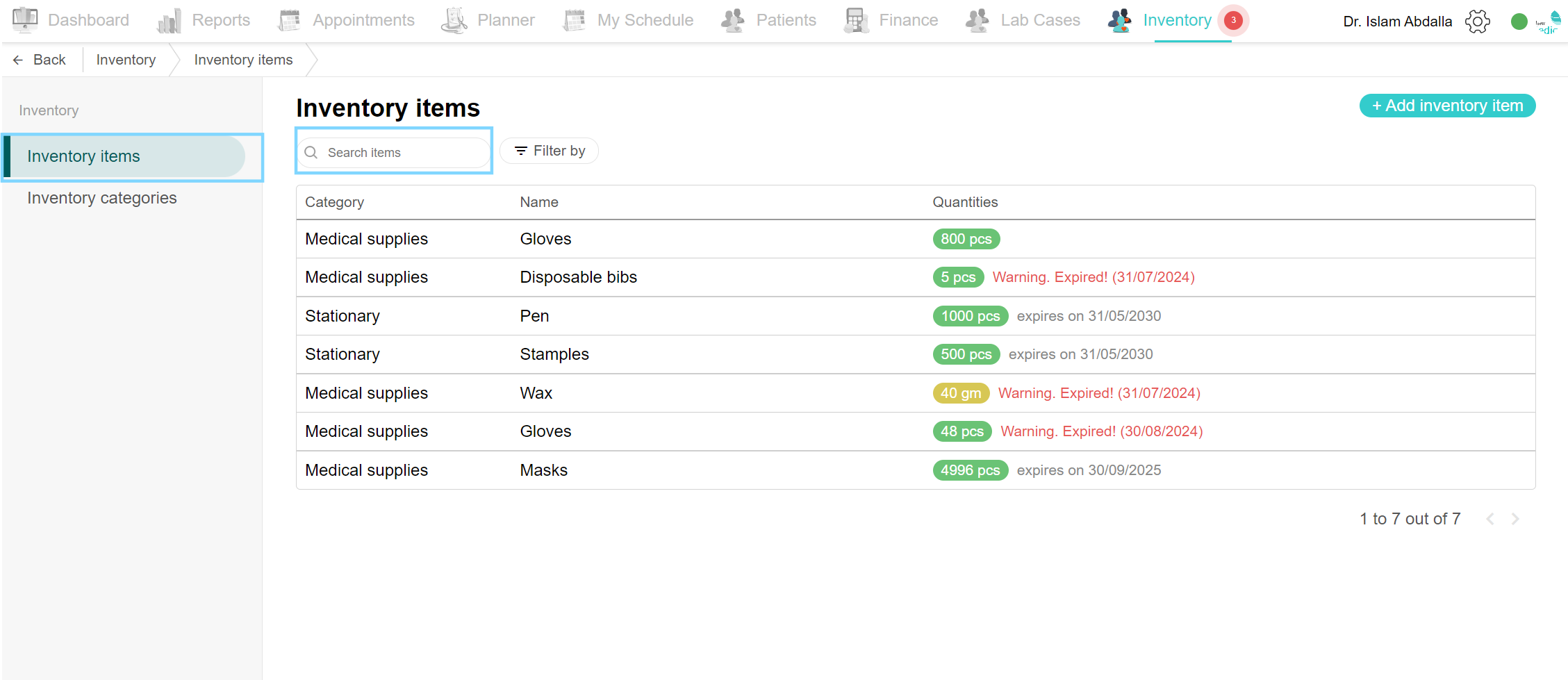 To manage the inventory items added by your clinic, navigate to the Inventory tab and open the Inventory items page.