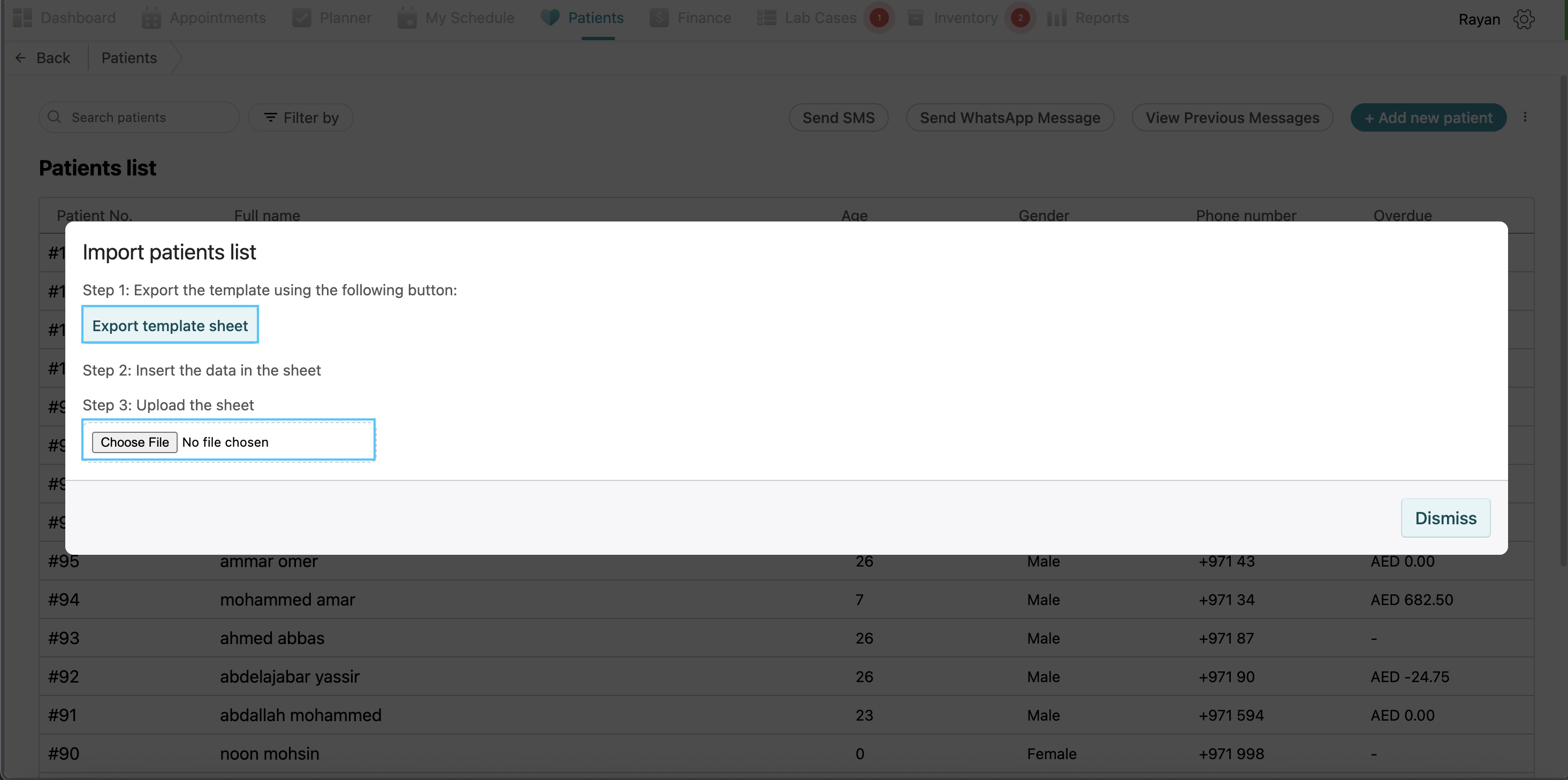To search for an existing patient, go to the "Patients" tab. You have a list of all patients. You can search by patient name, file number, phone number, or ID.