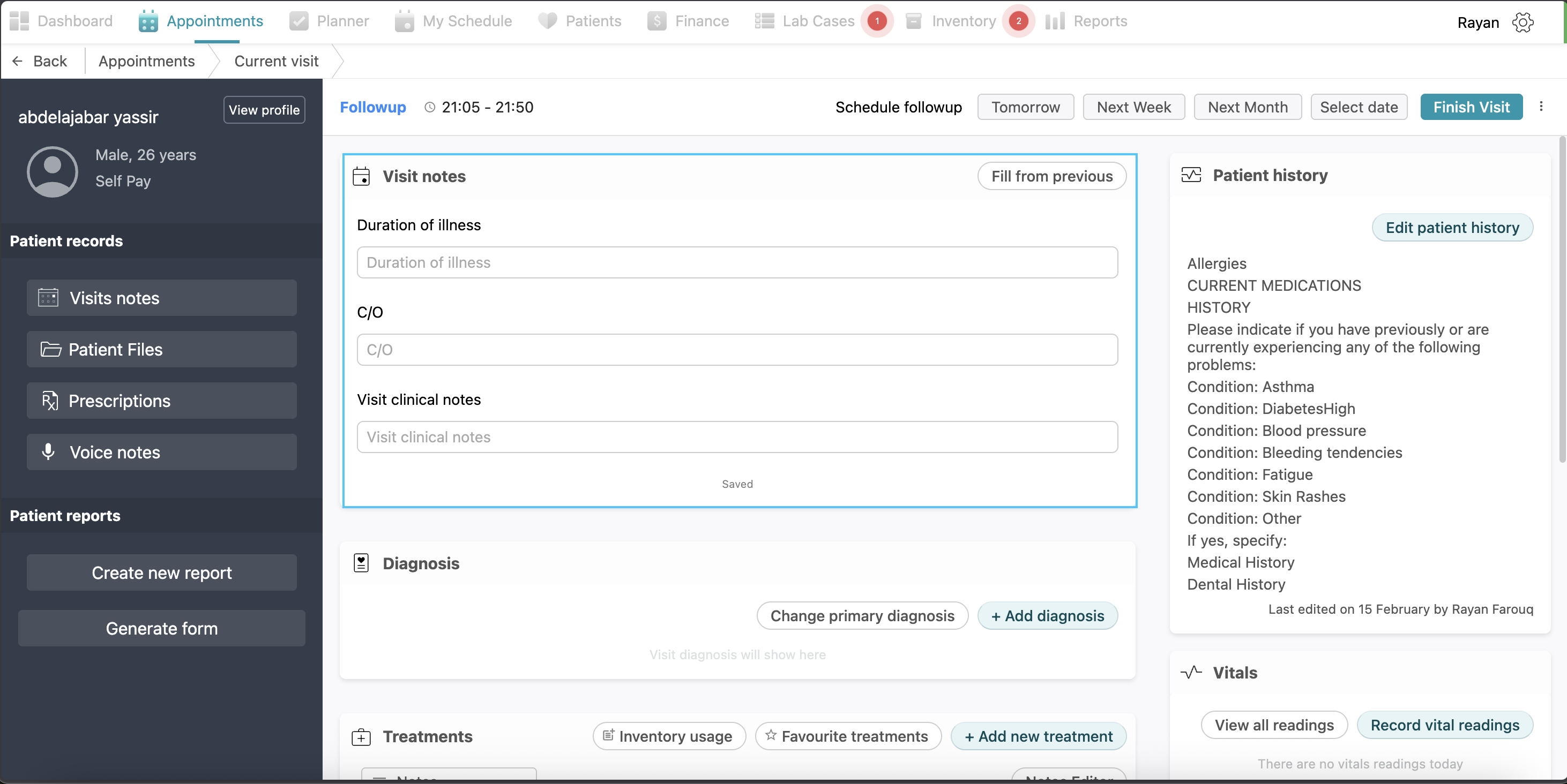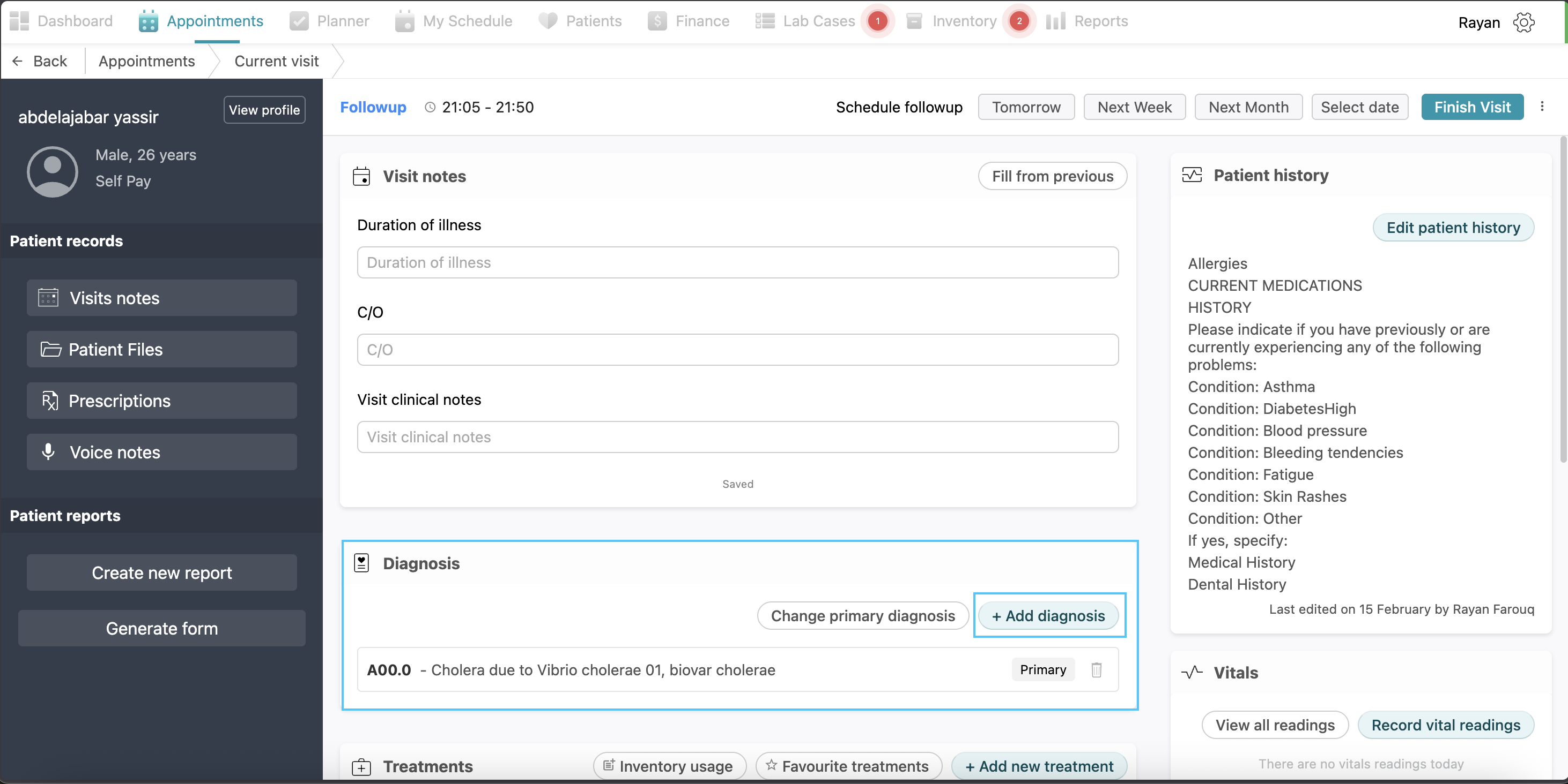 Visit Notes: This section stores historical clinical data, including the duration of the patient's illness, Chief Complaint (C/O) and specific visit clinical notes from previous visits.