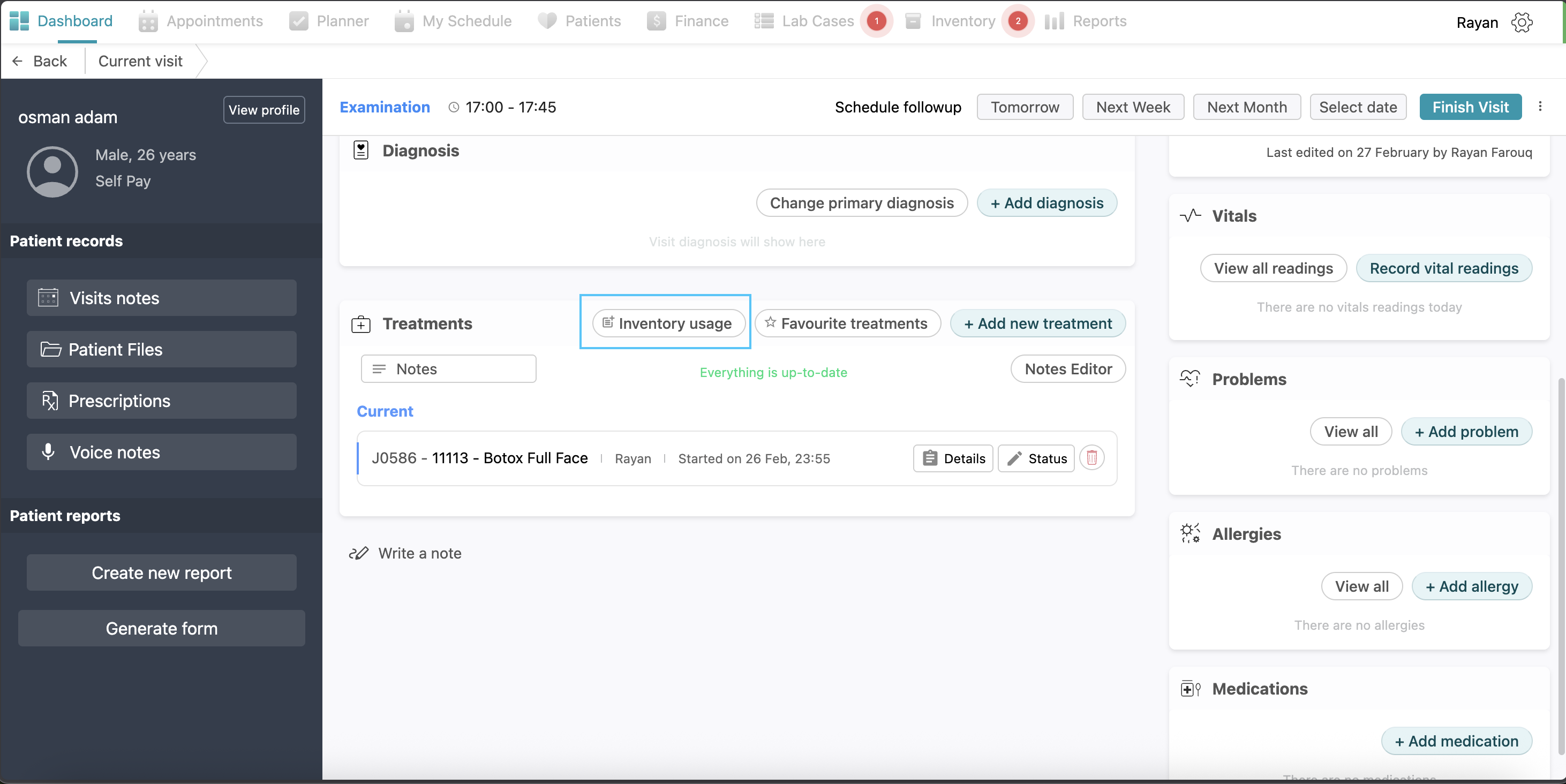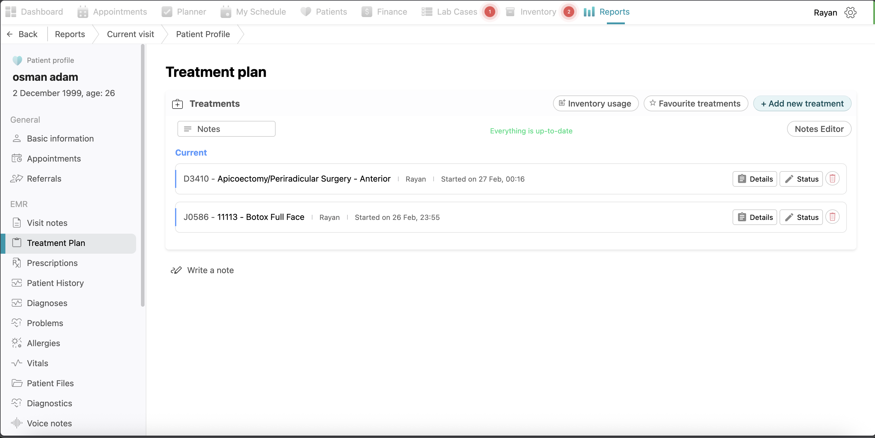Treatment Plan: This section provides all treatments done to the patient with the same options of adding new treatments, managing favorites, notes editor, and adding inventory usage as explained above.