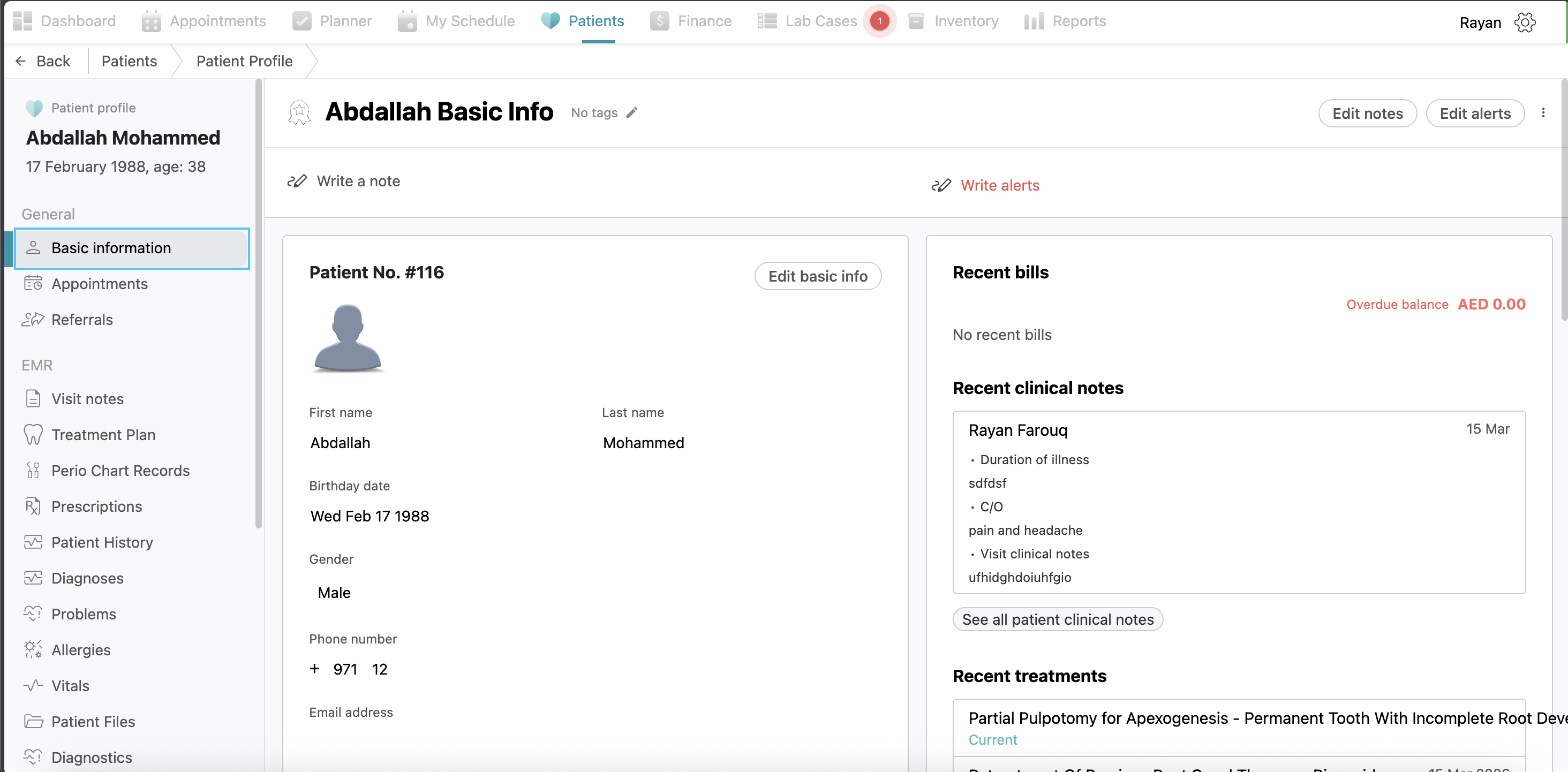 Here you can see the patient’s basic data like name, phone number…etc, and additional information like insurance, address,...etc.